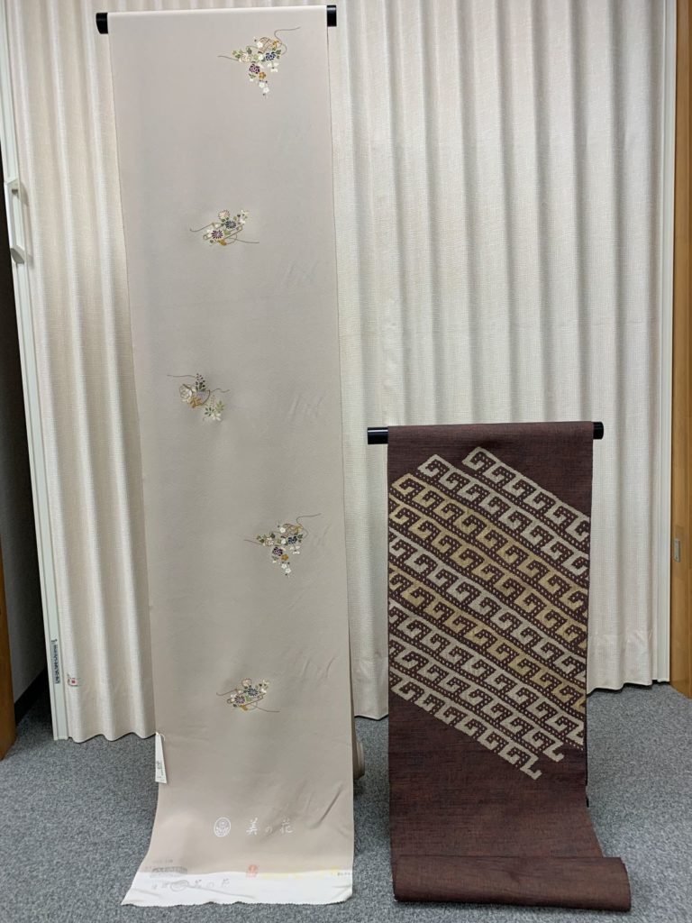 とび柄の花筏小紋のキモノに茶系統色の名古屋帯をコーディネートしてみました