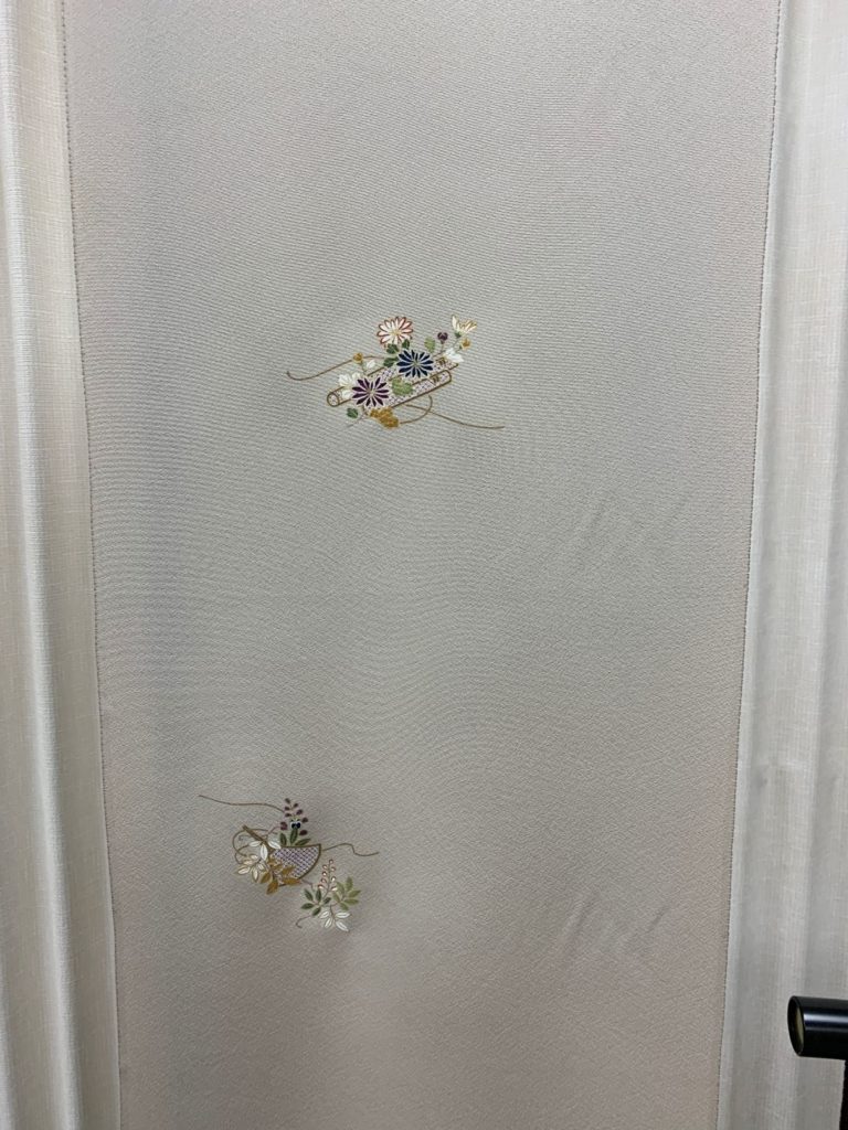 ベージュ地色の花筏小紋にボカシ織になったナスカ波文の名古屋帯が良く調和していると思います