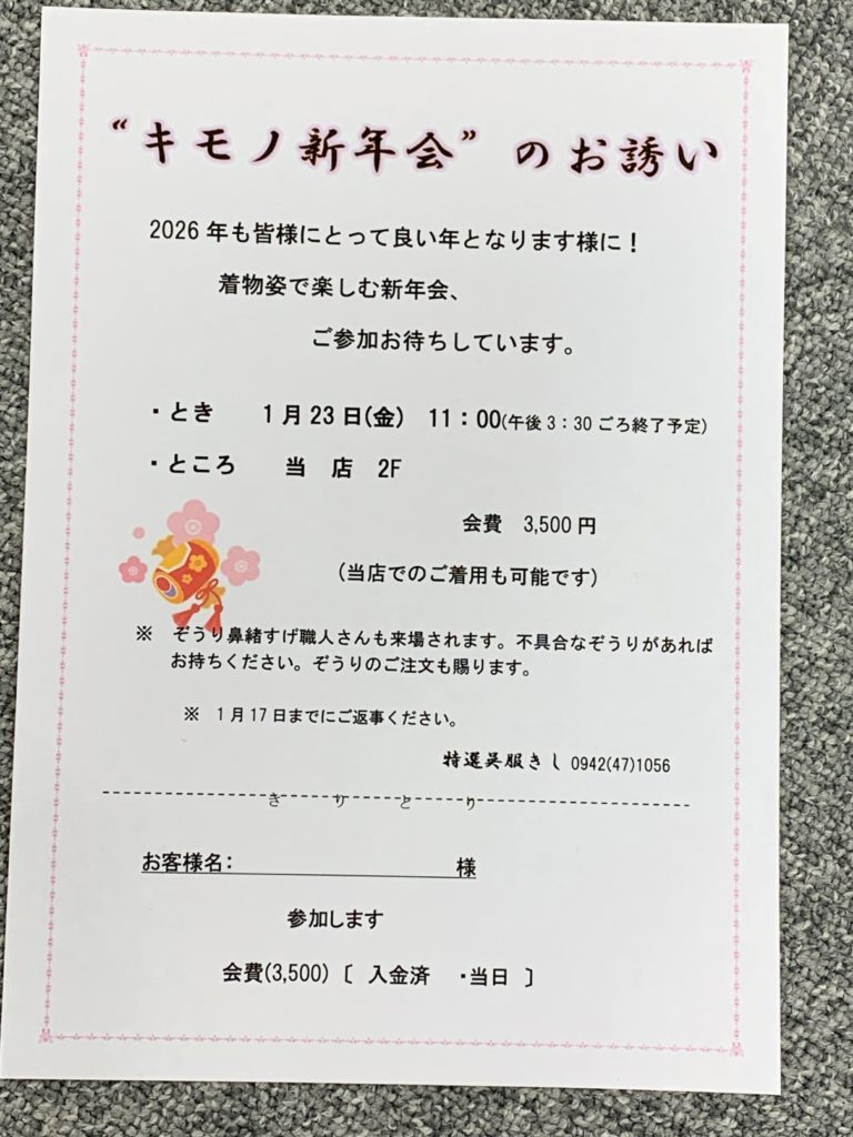 “キモノ新年会”のお誘い 投稿日: 2026年1月7日 投稿者: kishi 新年明けましておめでとうございます。 ことしもよろしくお願いします。 / 今年も”キモノ新年会”を催します。 1月23日(金)AM11時からです。 昨年同様初春にふさわしい、「謡曲・小謡い」「日舞おどり}から始める予定です。 / 今回は、ぞうり鼻緒すげ職人さんも来場され、別誂えのぞうり販売はもちろんの事 お手持ちの不具合なぞうりの修理なども承ります。 ご持参ください。 / キモノ着用機会の提供も兼ての催しです。 着物好きの方のご参加、お待ちしております 〈1月17日まで受け付けています〉