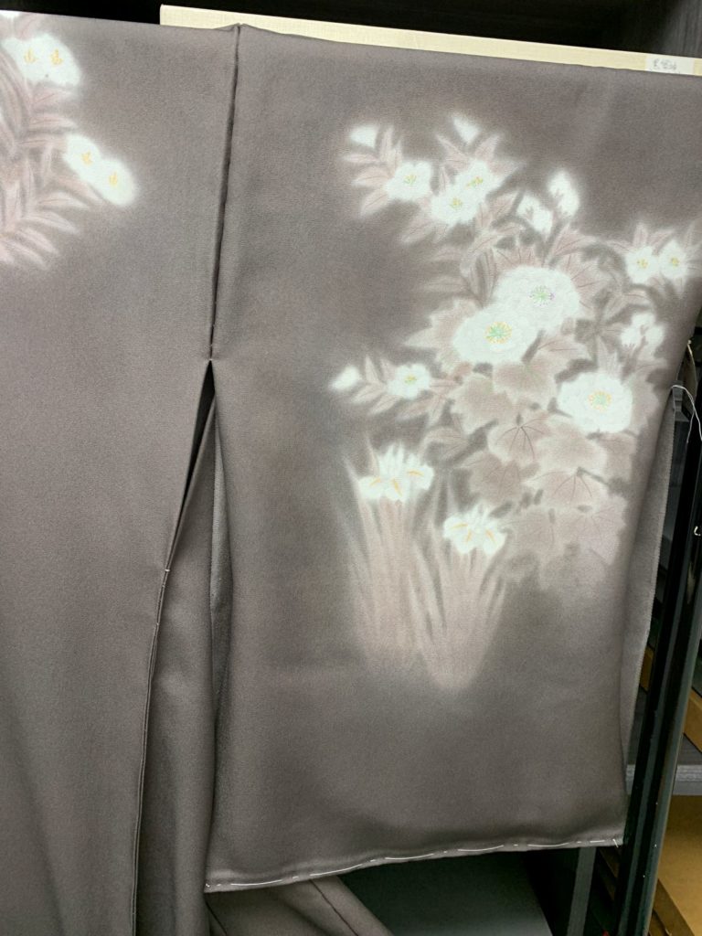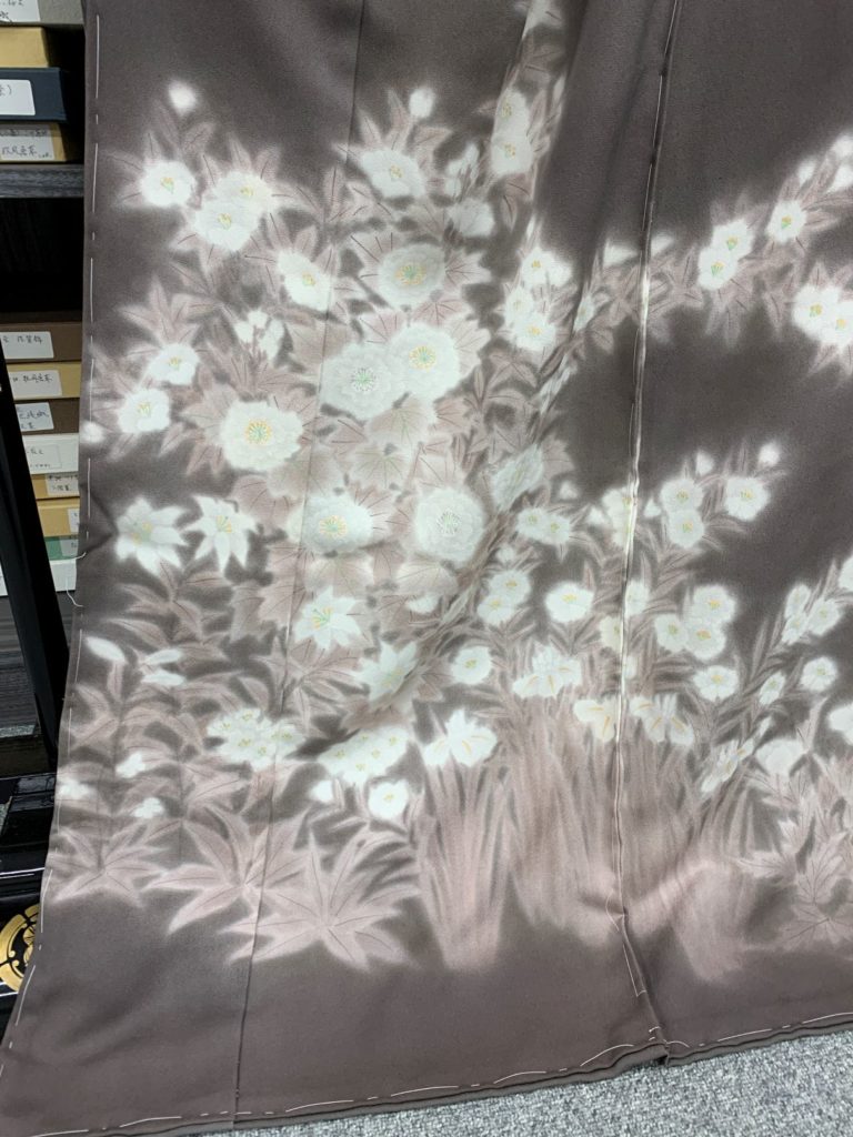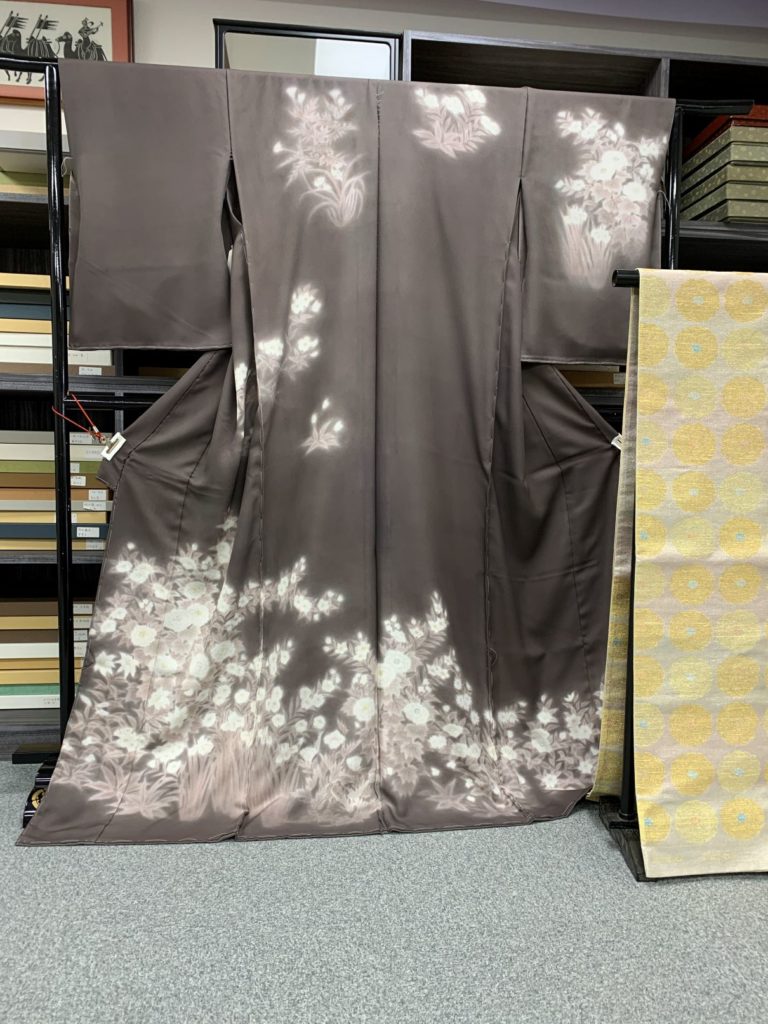 無線友禅訪問着にねん金綴錦袋帯をコーディネート 投稿日: 2026年2月25日 投稿者: kishi 濡れ描き技法の無線友禅には幽玄の世界へと誘ってくれます。 仁志山謙一氏の無線友禅訪問着の紹介です。 ネズミ色がかった焦げ茶地に、白を基調にした色彩で草花が描かれています。 上前の柄です。 右うしろ袖。 糸目友禅とは対照的な雰囲気があり、何とも言えない空気が漂っています。 / 帯はねん金綴錦の袋帯をコーディネートしています。 名古屋の徳川美術館に保管されている「黄金のねん金袱紗」があります。 その裂を復元して帯にしたのが「ねん金綴錦」の帯です。 / ご来店のうえ手に取ってご覧ください。