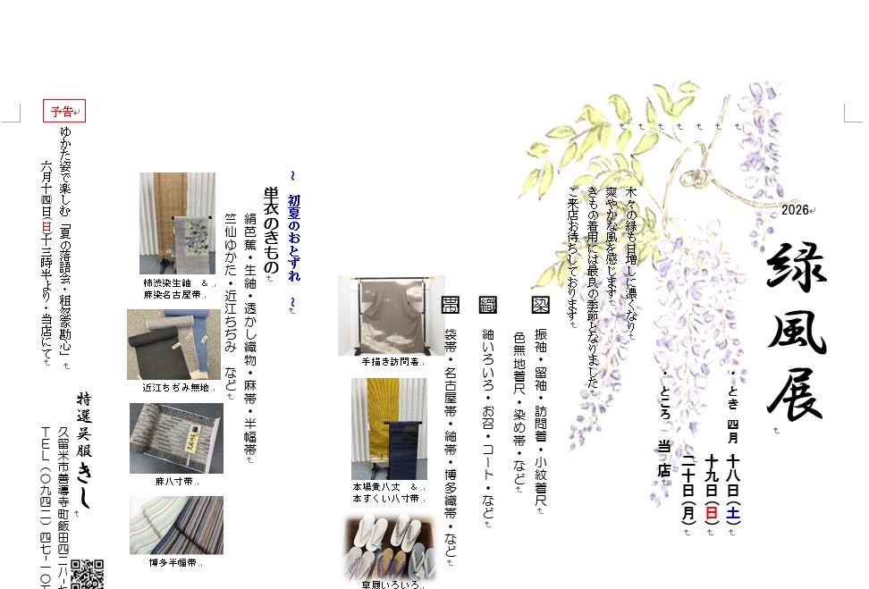 緑風展(4月18~20日展示会)の予告 投稿日: 2026年3月23日 投稿者: kishi 桜の開花もあちらこちらで聞かれ、本当に春めいてきました。 / 4月に開催する展示会の予告・お誘いです。 冬用のきものはもちろんの事、今回は単衣・夏物のコーナーも用意しています。 竺仙ゆかた、近江ちぢみ、半幅帯、ひとえ、夏キモノなども取り揃えています。 / 是非、ご来店お待ちしております。 / 予告の予告になりますが、6月14日(日)、当店にて「夏のお楽しみ落語・粗忽家勘心」も企画しています。 お楽しみに!